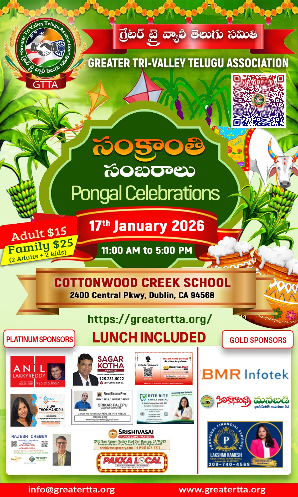 Greater Tri-Valley Telugu Associattion (GTTA) extends a warm welcome to the entire Telugu diaspora in greater Tri-valley region and beyond to join in celebrating Sankranti, in its true spirit. Sankranti also popularly known as Pongal in Southern India, not only a major festival of Telugu people, it symbolizes the harvest season for farmers and bringing family together in celebrating festivities and remembering our ancestors. The Sankranti spirit will be in full display in San Ramon on January 13th. Don't miss this opportunity to celebrate and inculcate our traditions among our younger generation.